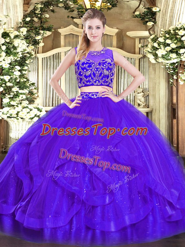 Purple Two Pieces Tulle Scoop Sleeveless Beading and Ruffles Floor Length Zipper Quinceanera Gown