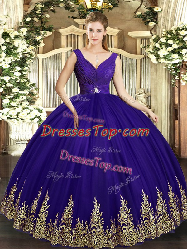 Purple V-neck Neckline Beading and Appliques Vestidos de Quinceanera Sleeveless Backless