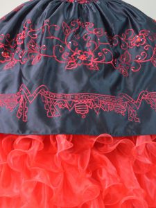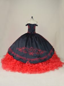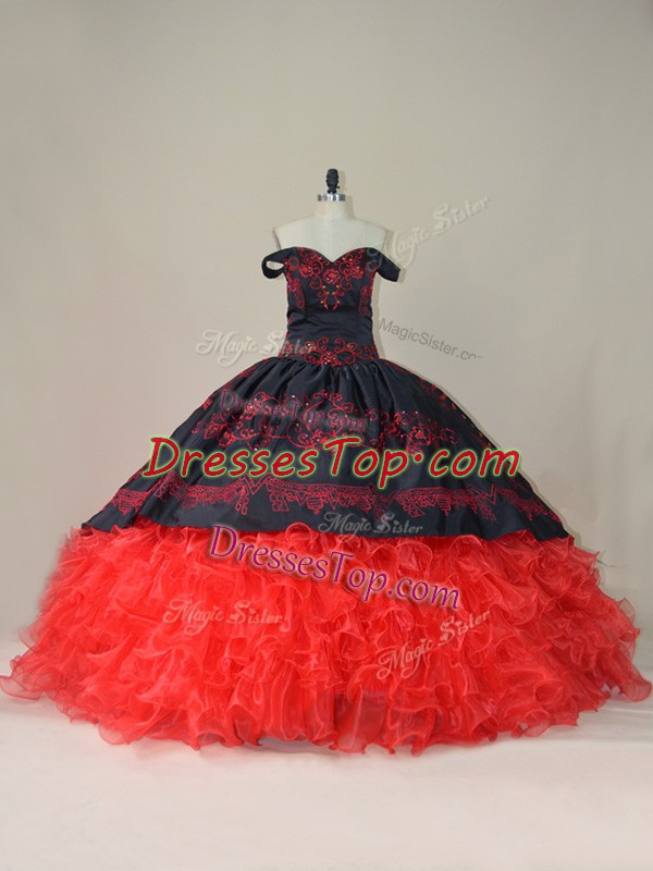 Red And Black 15 Quinceanera Dress Sweet 16 and Quinceanera with Embroidery and Ruffles Off The Shoulder Sleeveless Brush Train Lace Up
