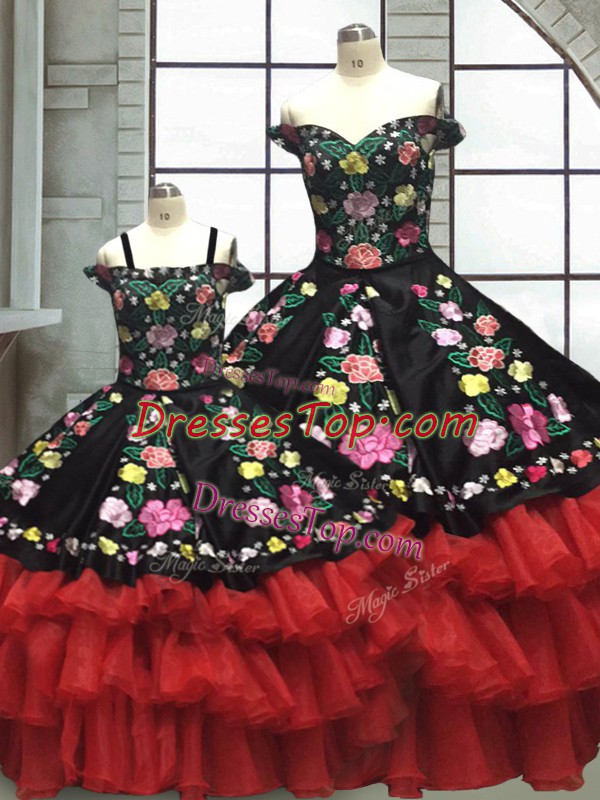 Red And Black Ball Gowns Organza and Taffeta Off The Shoulder Sleeveless Embroidery and Ruffled Layers Floor Length Lace Up Quince Ball Gowns