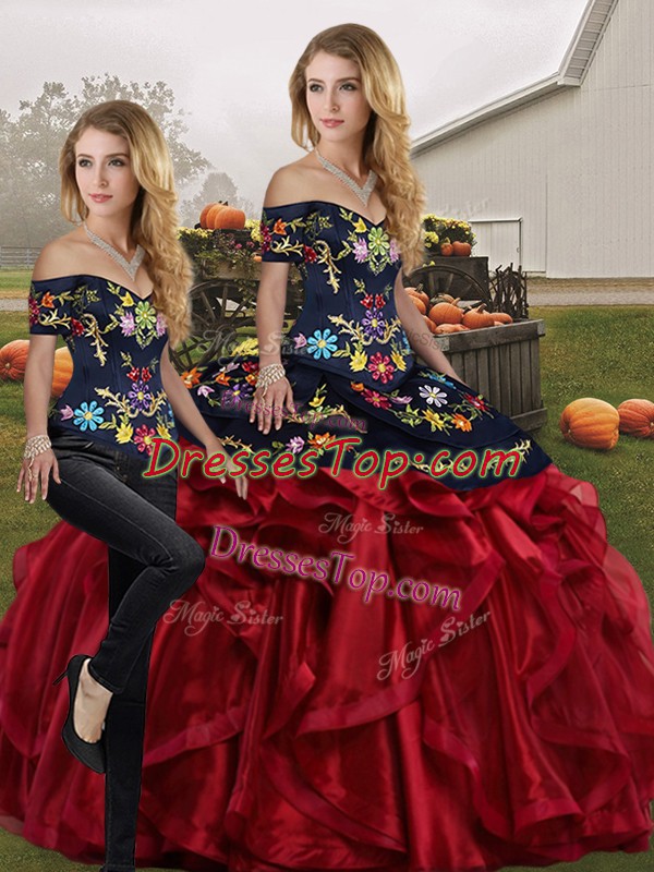 Red And Black Vestidos de Quinceanera Military Ball and Sweet 16 and Quinceanera with Embroidery and Ruffles Off The Shoulder Sleeveless Lace Up