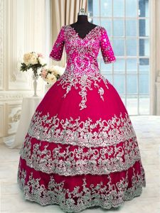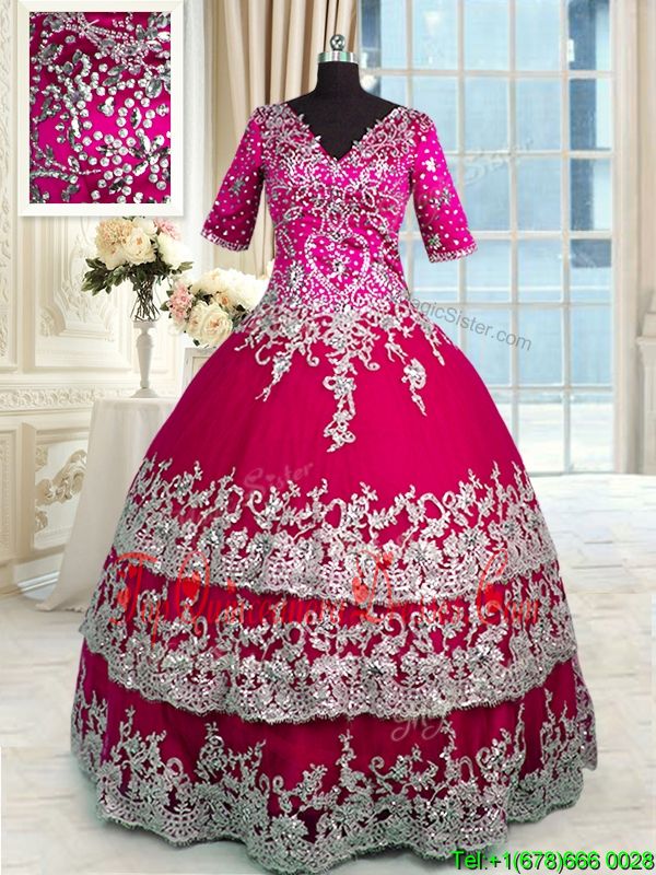Red and Hot Pink 15 Quinceanera Dress Military Ball and Sweet 16 and Quinceanera and For with Beading and Appliques and Ruffled Layers V-neck Half Sleeves Zipper