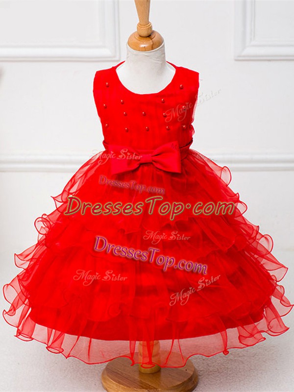 Red Ball Gowns Scoop Sleeveless Organza Tea Length Zipper Ruffled Layers and Bowknot Little Girls Pageant Dress Wholesale