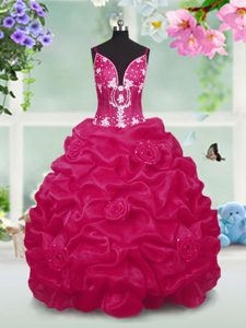Red Ball Gowns V-neck Sleeveless Taffeta Floor Length Lace Up Beading and Pick Ups Evening Gowns