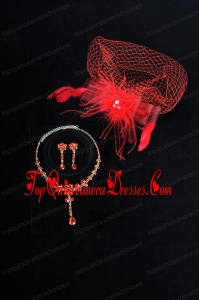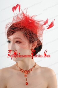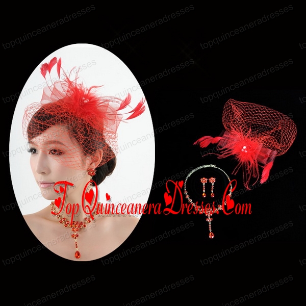 Red Crystal Wedding Jewelry Set With Necklace and Feather Headpiece