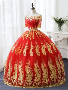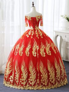 Red Half Sleeves Floor Length Appliques Lace Up Quinceanera Gowns