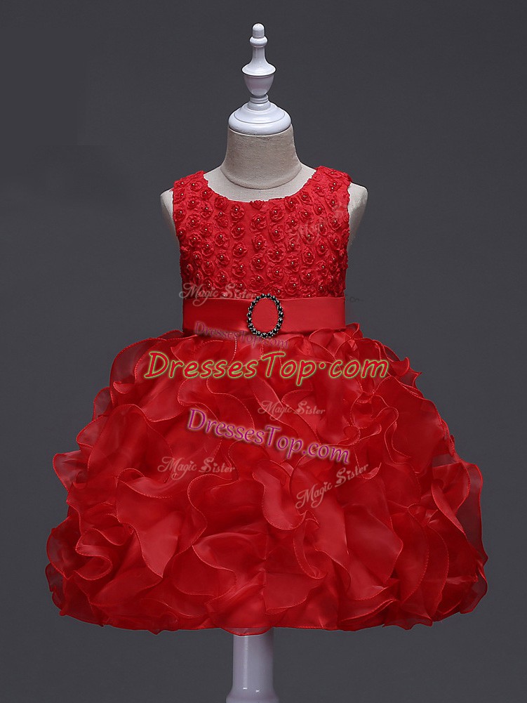 Red Little Girl Pageant Dress Wedding Party with Ruffles and Belt Scoop Sleeveless Lace Up