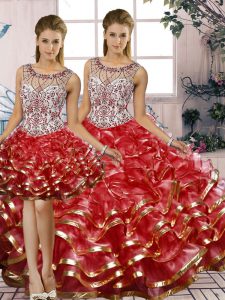 Red Organza Lace Up 15th Birthday Dress Sleeveless Floor Length Beading and Ruffles