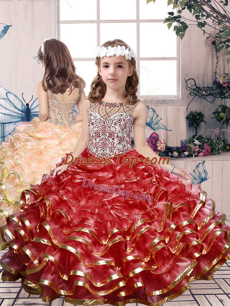 Red Organza Lace Up Little Girl Pageant Gowns Sleeveless Floor Length Beading and Ruffles