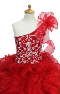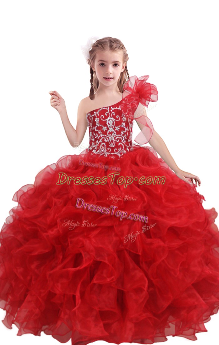 Red Organza Lace Up One Shoulder Sleeveless Floor Length Kids Formal Wear Beading and Ruffles
