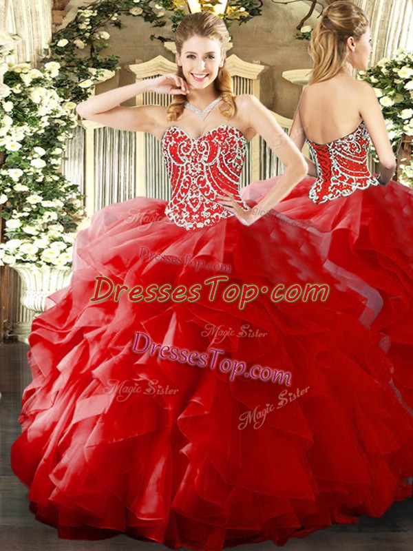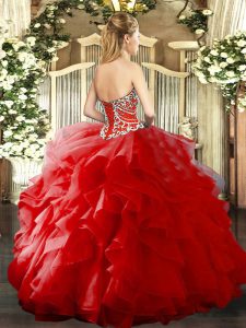 Red Organza Lace Up Sweetheart Sleeveless Floor Length Sweet 16 Quinceanera Dress Beading and Ruffles