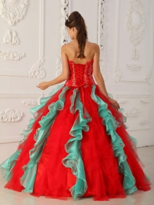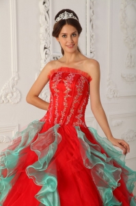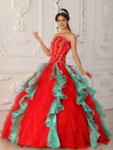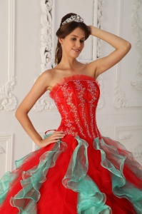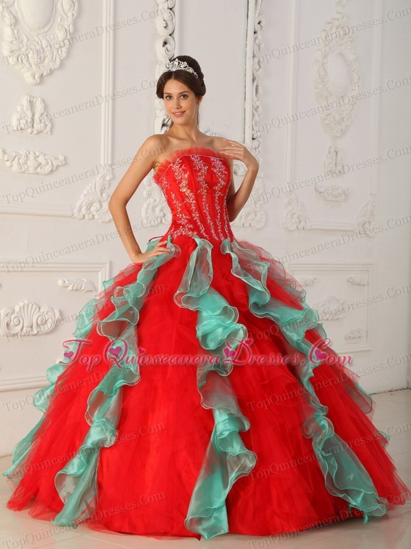 Red Quinces Dresses Strapless Green Ruffles Embroidery