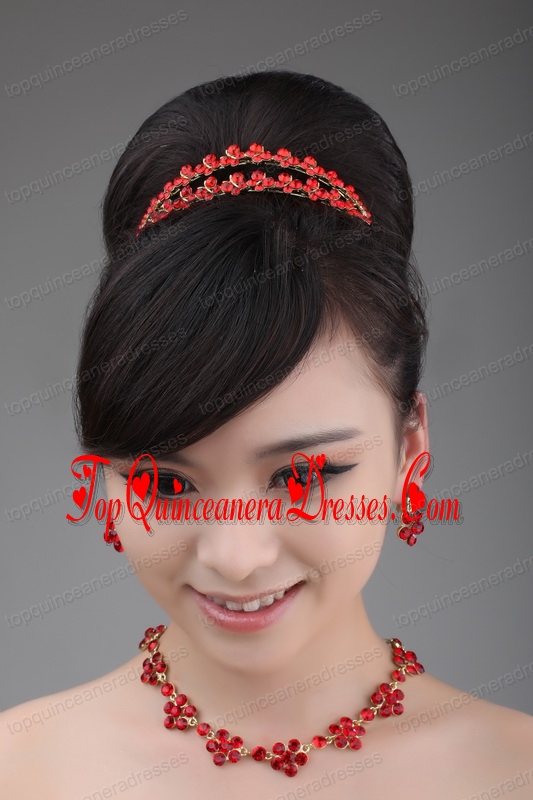 Red Rhinestone Wedding Jewelry Set Including Necklace Crown And Earrings