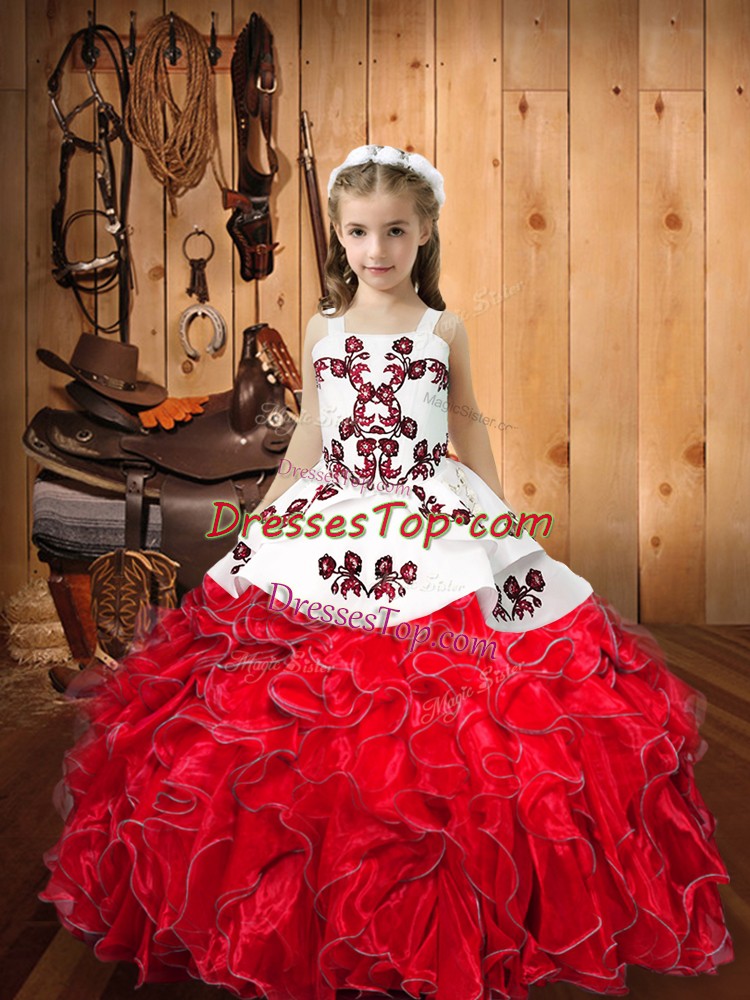 Red Straps Neckline Embroidery and Ruffles Little Girl Pageant Gowns Sleeveless Lace Up