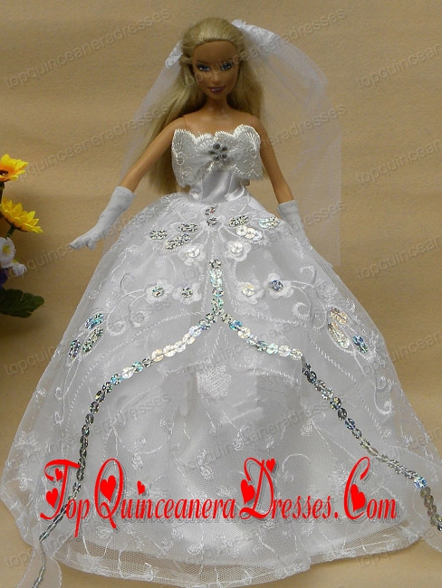 Romantic Appliques White Strapless Wedding Dress For Barbie Doll