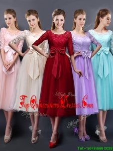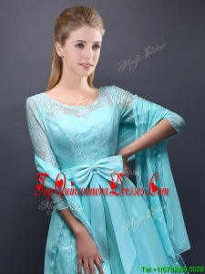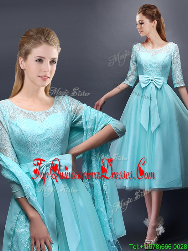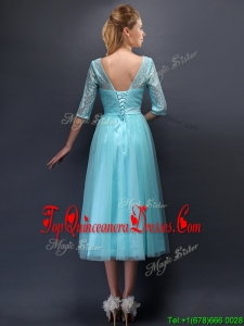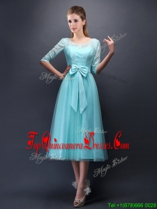 Romantic Aqua Blue Scoop Half Sleeves Quinceanera Dama Dress with Bowknot
