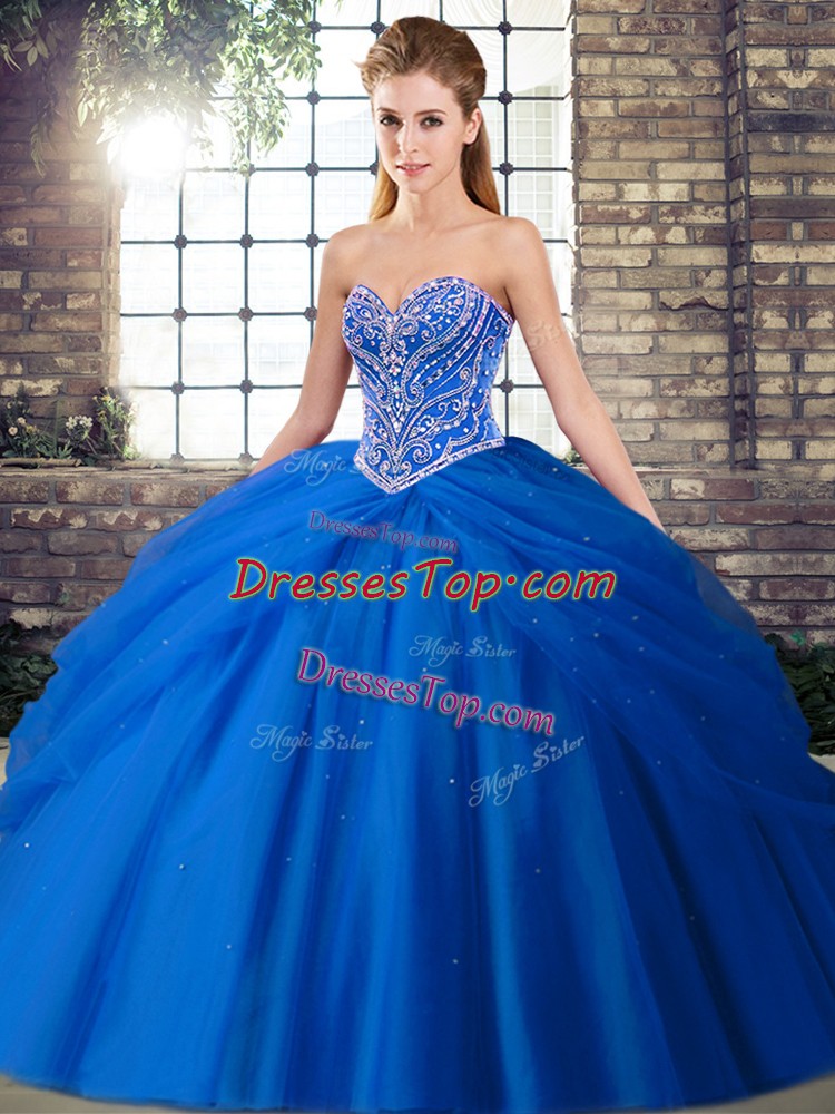 Romantic Ball Gowns Sleeveless Blue Sweet 16 Quinceanera Dress Brush Train Lace Up
