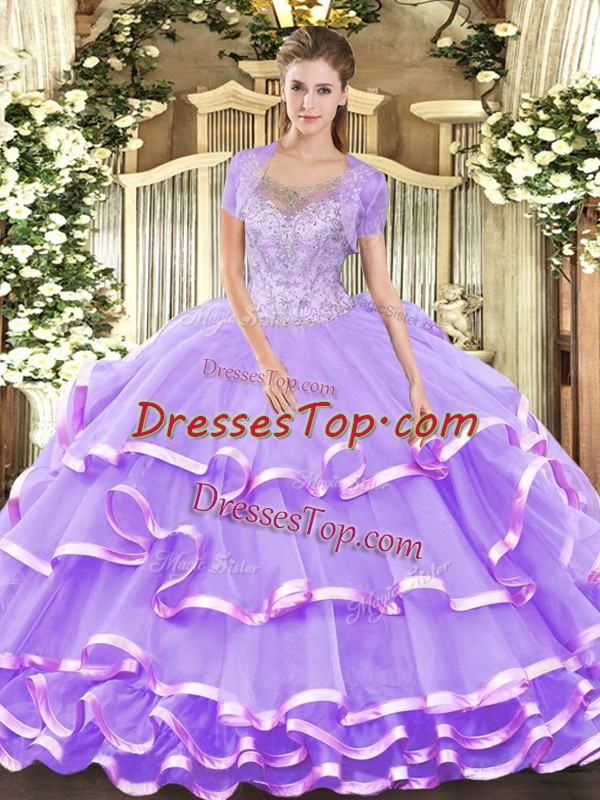Romantic Lavender Scoop Lace Up Beading and Ruffled Layers Vestidos de Quinceanera Sleeveless
