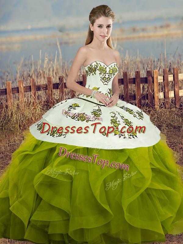Romantic Olive Green Ball Gowns Sweetheart Sleeveless Tulle Floor Length Lace Up Embroidery and Ruffles and Bowknot Vestidos de Quinceanera