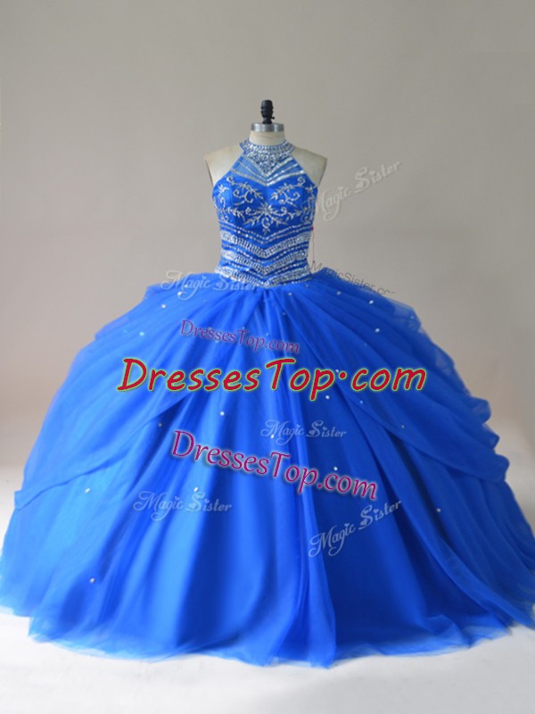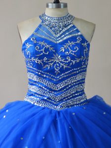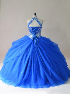 Romantic Royal Blue Halter Top Neckline Beading Ball Gown Prom Dress Sleeveless Lace Up
