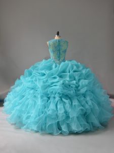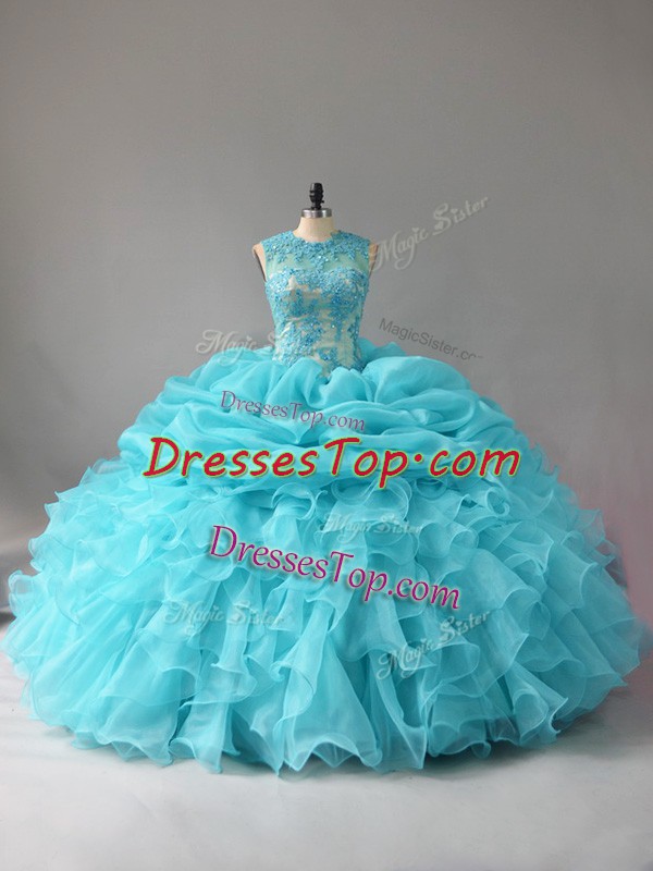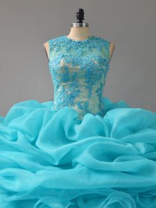 Romantic Scoop Sleeveless Quince Ball Gowns Floor Length Appliques and Ruffles and Pick Ups Aqua Blue Organza