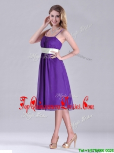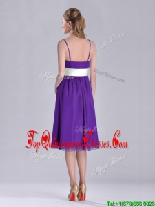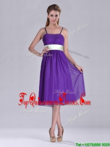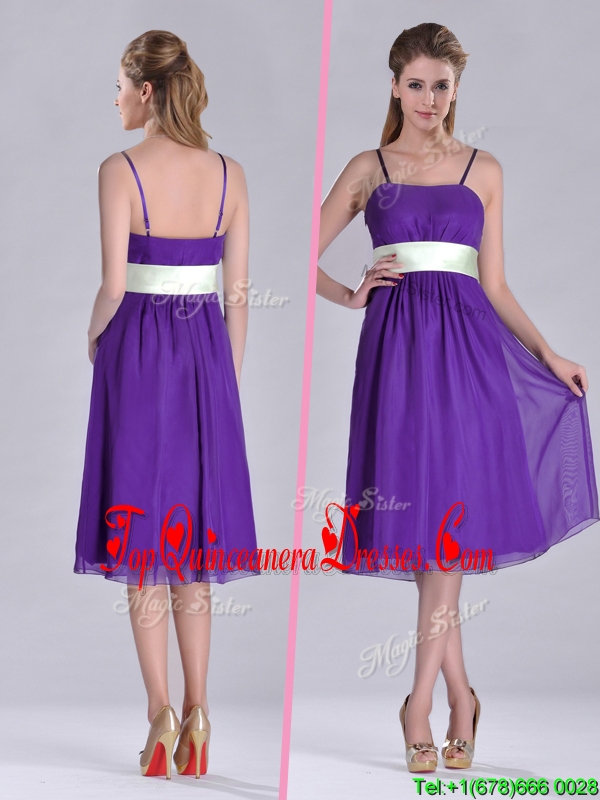 Romantic Spaghetti Straps Belted Eggplant Purple Dama Dress in Tea Length