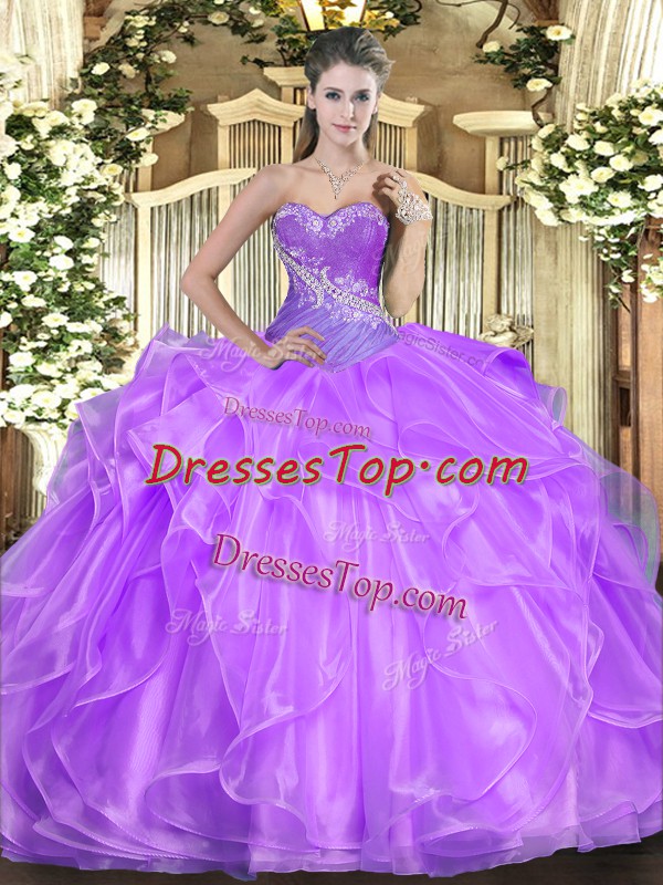 Romantic Sweetheart Sleeveless Quince Ball Gowns Floor Length Beading and Ruffles Lilac Organza