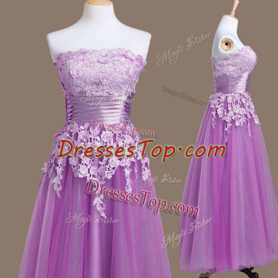 Romantic Tea Length Lace Up Quinceanera Court of Honor Dress Purple for Prom and Party and Wedding Party with Appliques