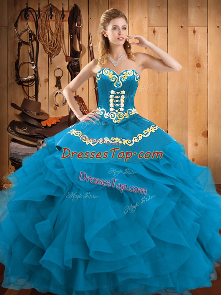 Romantic Teal Ball Gowns Sweetheart Sleeveless Satin and Organza Floor Length Lace Up Embroidery and Ruffles Sweet 16 Dress