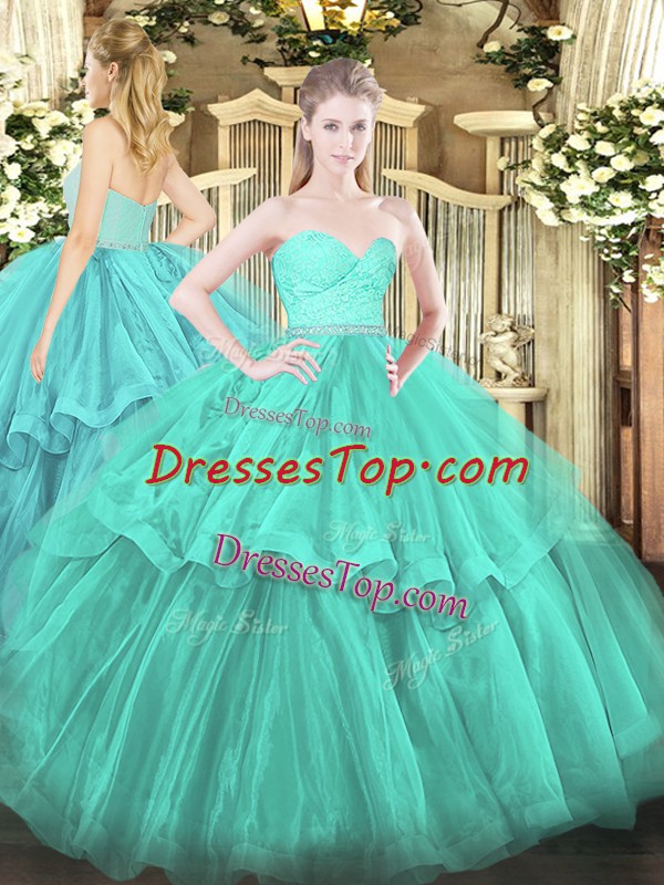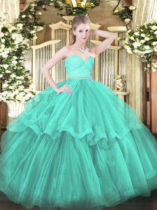 Romantic Turquoise Tulle Zipper Sweetheart Sleeveless Sweet 16 Dress Brush Train Beading and Lace and Ruffled Layers