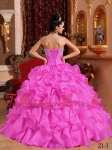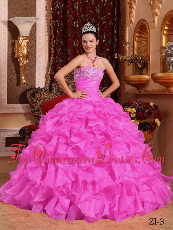 Rose Pink Ball Gown Strapless Floor-length Organza Beading and Appliques Quinceanera Dress