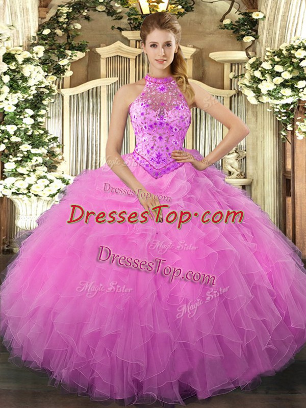Rose Pink Ball Gowns Organza Halter Top Sleeveless Beading and Ruffles Floor Length Lace Up Quince Ball Gowns