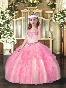 Rose Pink Ball Gowns Organza Straps Sleeveless Beading and Ruffles Floor Length Lace Up Pageant Dress for Teens