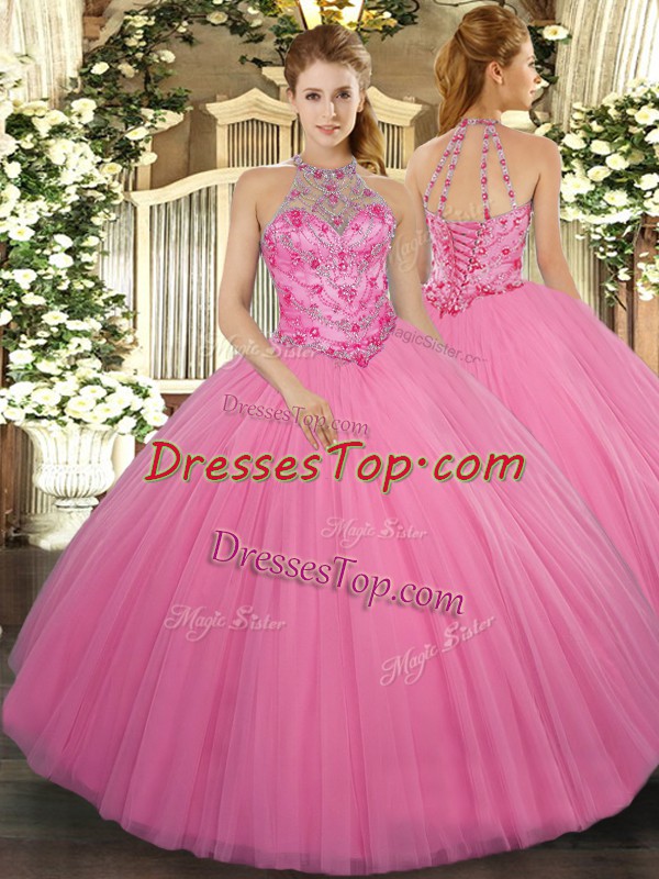 Rose Pink Halter Top Neckline Beading 15th Birthday Dress Sleeveless Lace Up