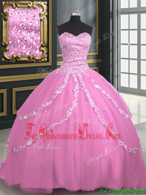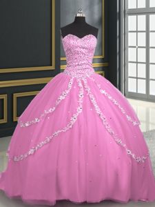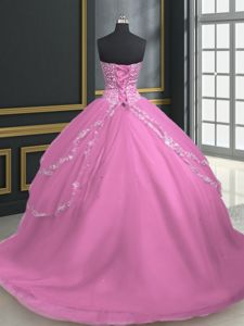 Rose Pink Lace Up Quinceanera Dress Beading and Appliques Sleeveless With Brush Train