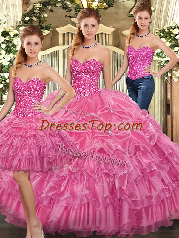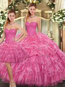 Rose Pink Lace Up Sweetheart Beading and Ruffles Ball Gown Prom Dress Organza Sleeveless