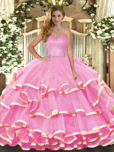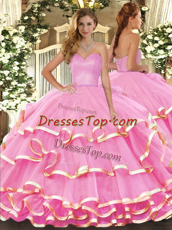 Rose Pink Organza Lace Up Sweetheart Sleeveless Floor Length Sweet 16 Quinceanera Dress Ruffled Layers
