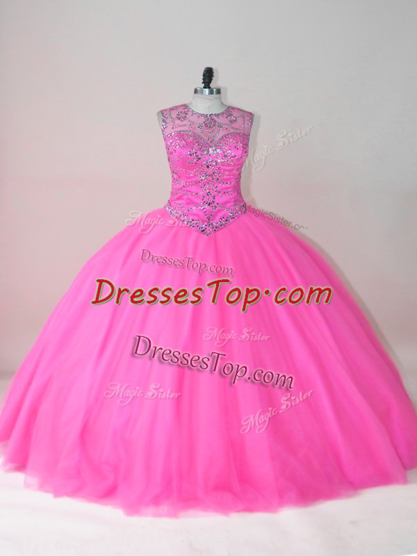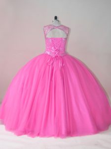 Rose Pink Scoop Lace Up Beading Quinceanera Gown Sleeveless