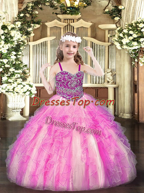 Rose Pink Sleeveless Floor Length Beading and Ruffles Lace Up Pageant Dress Wholesale