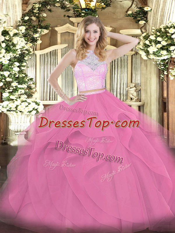 Rose Pink Sleeveless Tulle Zipper Quinceanera Gowns for Military Ball and Sweet 16 and Quinceanera