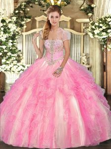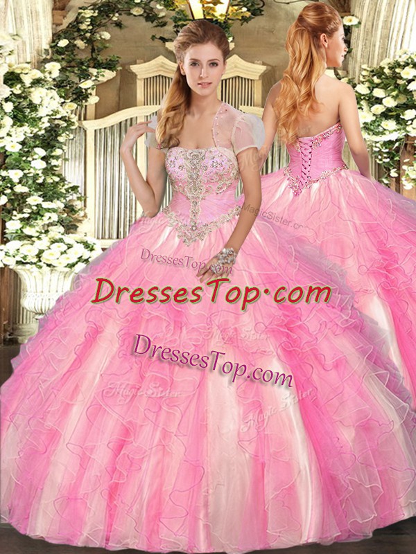 Rose Pink Strapless Lace Up Appliques and Ruffles 15th Birthday Dress Sleeveless