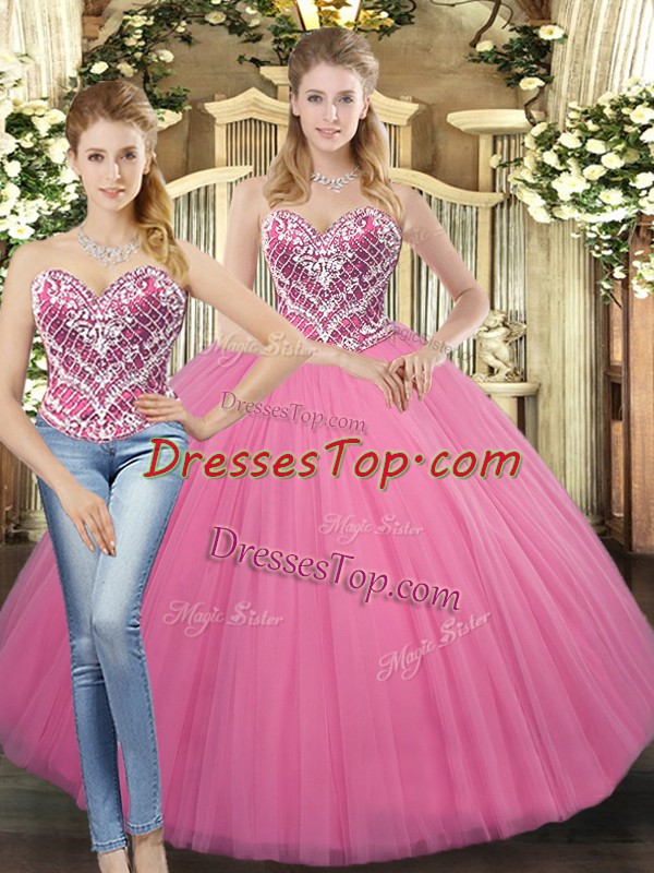 Rose Pink Tulle Lace Up 15th Birthday Dress Sleeveless Floor Length Beading