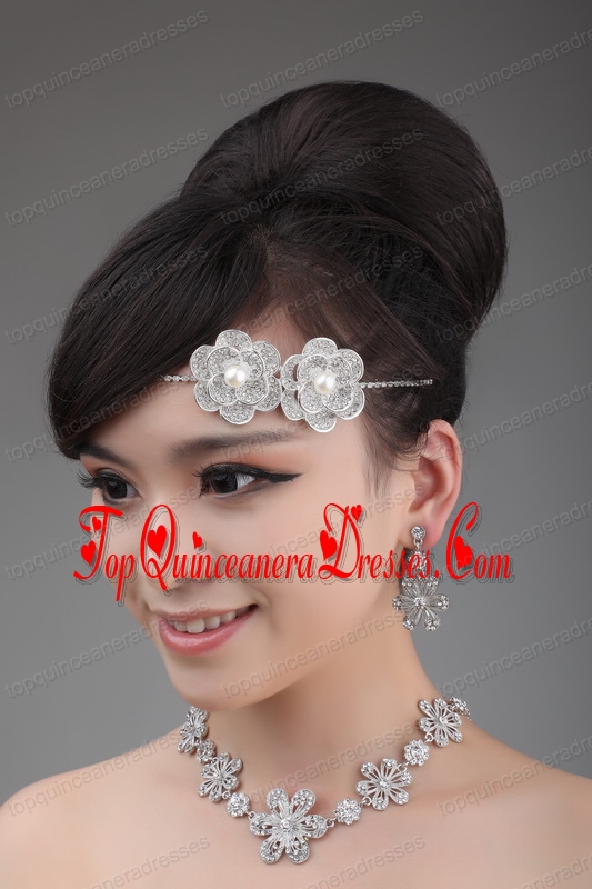 Round Shape Pearl and Alloy and Rhinestone Tiara and Necklace