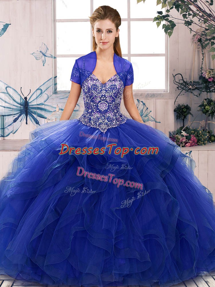 Royal Blue Ball Gowns Beading and Ruffles Quinceanera Dress Lace Up Tulle Sleeveless Floor Length