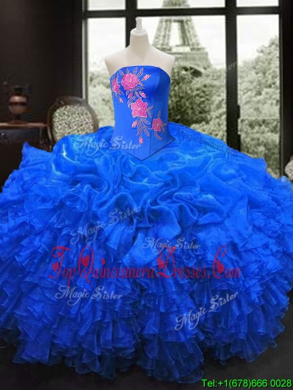Royal Blue Ball Gowns Embroidery and Ruffles Sweet 16 Dress Lace Up Organza Sleeveless Floor Length
