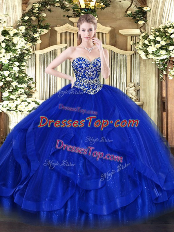 Royal Blue Ball Gowns Ruffles Quinceanera Gown Lace Up Tulle Sleeveless Floor Length