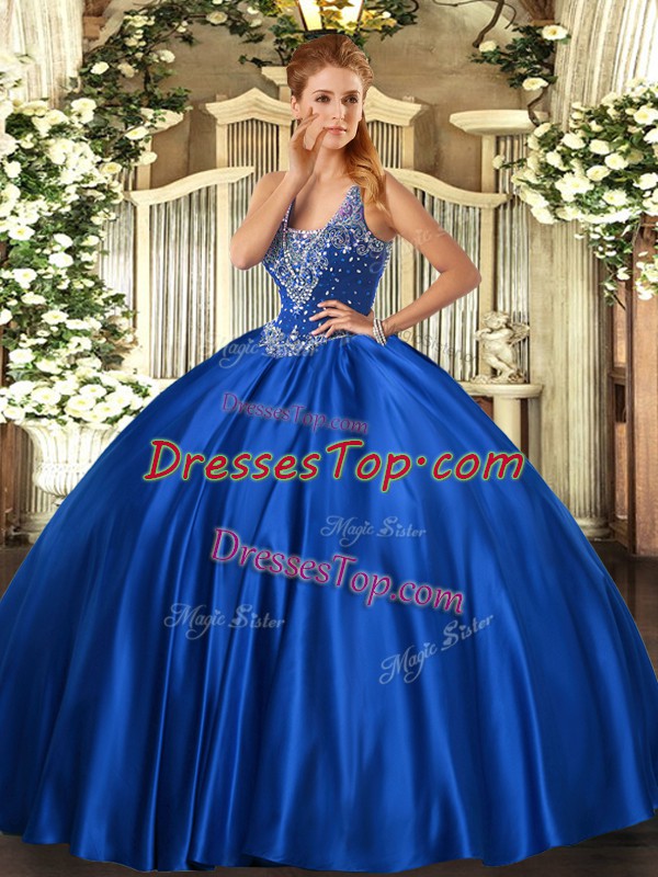 Royal Blue Ball Gowns Satin Straps Sleeveless Beading Floor Length Lace Up Vestidos de Quinceanera