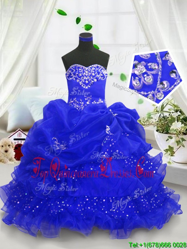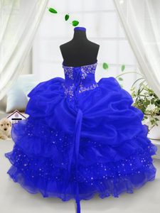 Royal Blue Ball Gowns Sweetheart Sleeveless Organza Floor Length Lace Up Beading and Ruffled Layers and Pick Ups Little Girl Pageant Gowns