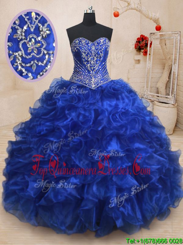 Royal Blue Lace Up Quince Ball Gowns Beading and Ruffles Sleeveless With Brush Train