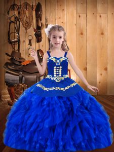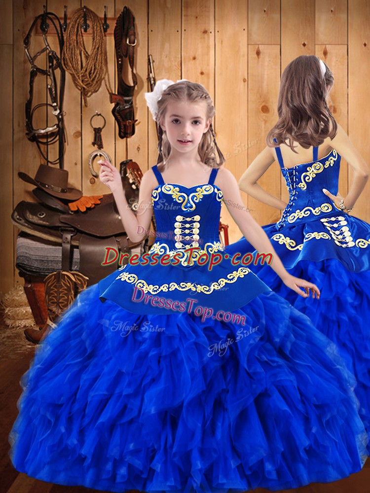 Royal Blue Organza Lace Up Straps Sleeveless Floor Length Pageant Dress Wholesale Embroidery and Ruffles
